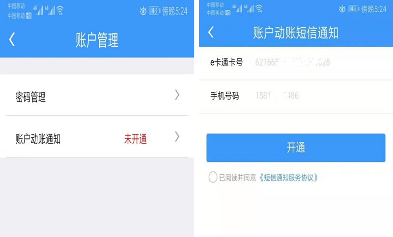 3.點擊賬戶動賬通知界面,顯示“鐵路e卡通”賬戶和手機號碼,選擇開通并勾選短信通知服務協(xié)議后點擊開通即可開通服務。