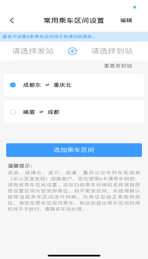 注意:川渝、西延、閩贛地區(qū)客戶,您在使用e卡通乘車碼前,須完成乘車區(qū)間設置。進站掃碼乘車時閘機系統(tǒng)將按照您設置區(qū)間為您安排席位。如不更改區(qū)間,系統(tǒng)將默認按照當前乘車區(qū)間進行判斷。為保證您能正常使用席位,請您在乘車區(qū)間內乘車,到達站超出乘車區(qū)間的閘機將不予放行,需聯(lián)系車站處理。