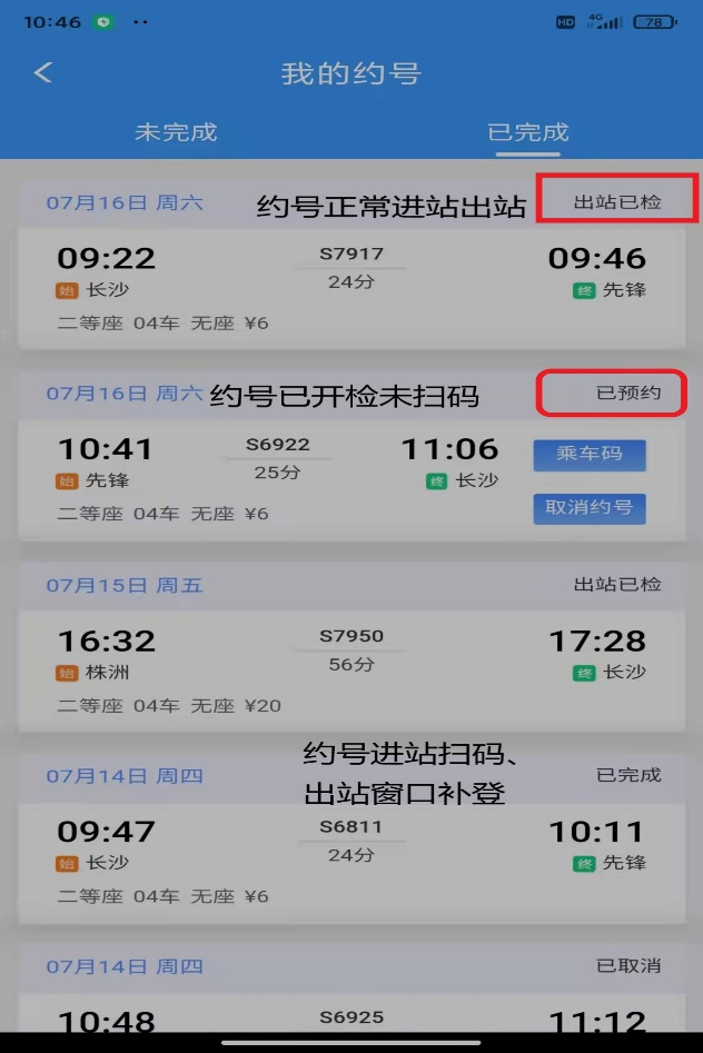 3)點擊“已完成”菜單查詢已過期約號、取消約號、已乘車約號等訂單。
