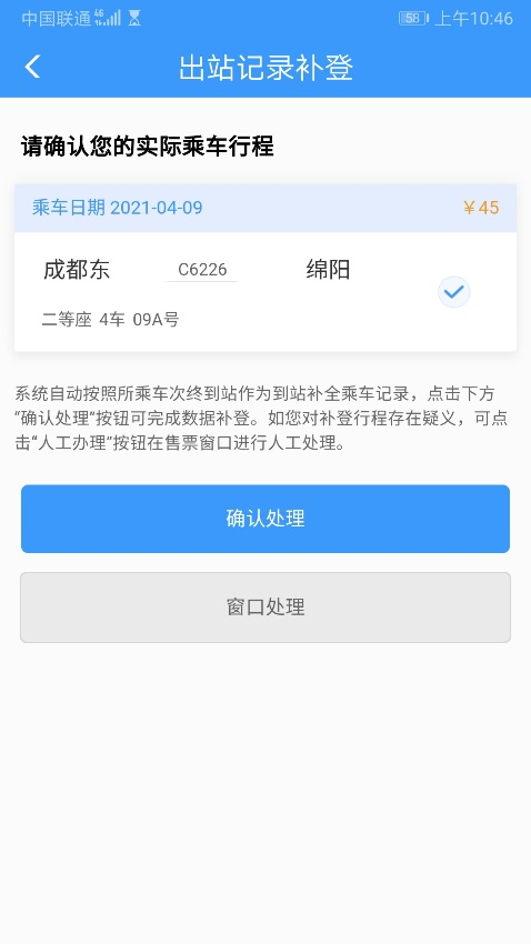 旅客選擇線上異常處理,選擇到站和車次,點擊確認處理即完成異常記錄處理過程,可正常生成乘車碼并掃碼乘車。