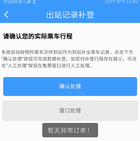 2、行程確認,旅客可根據(jù)12306的行程記錄確認乘車具體信息,旅客可自助選擇線上異常處理,若不認可行程記錄,旅客可前往銀通卡業(yè)務窗口處理。