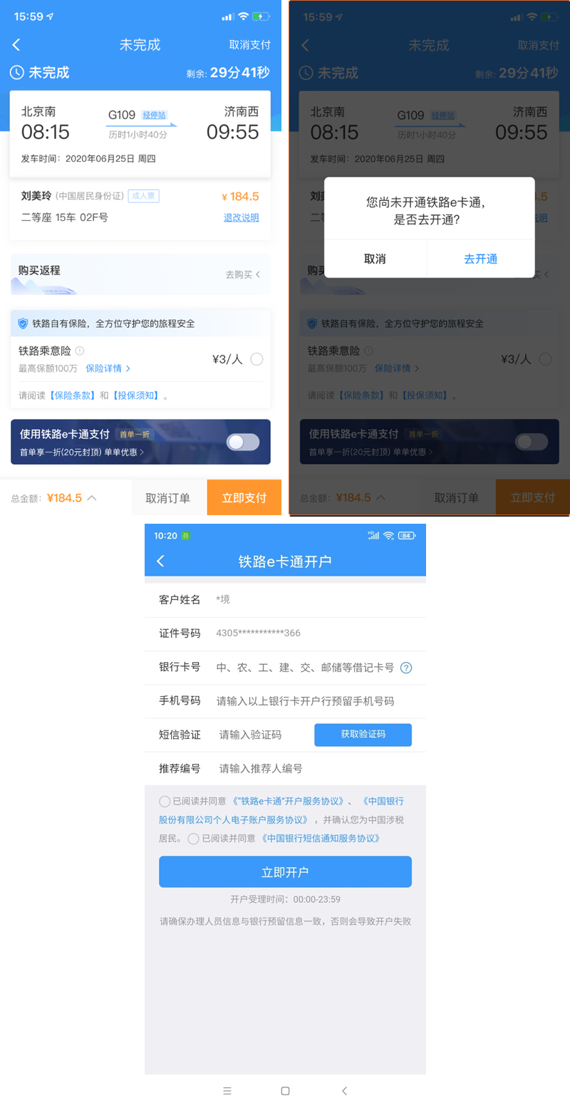 未開通“鐵路e卡通”用戶,在購票支付頁面時可以滑動開啟按鈕去開通“鐵路e卡通”賬戶。根據(jù)提示點擊“去開通”則跳轉鐵路e卡通開戶頁面,如果點擊取消停留在待支付頁面。