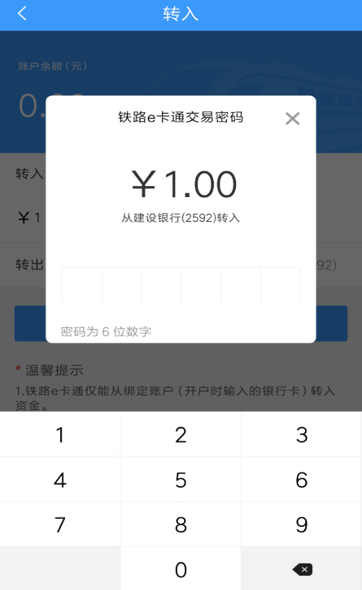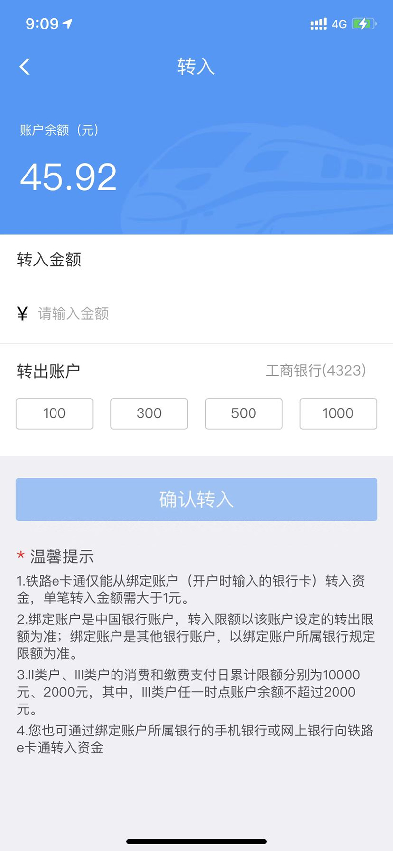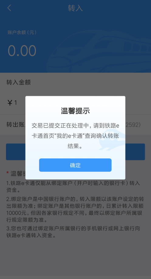 1.僅支持從綁定賬戶(開戶時輸入的銀行卡)向鐵路e卡通轉入資金。