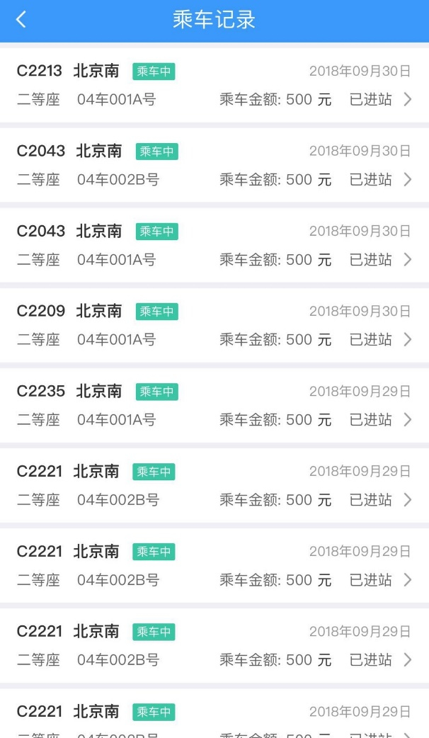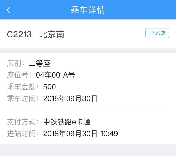 點擊每一條記錄還可查詢到詳細信息,包括:日期、車次、乘降狀態(tài)、發(fā)到站、席位、乘車金額等。