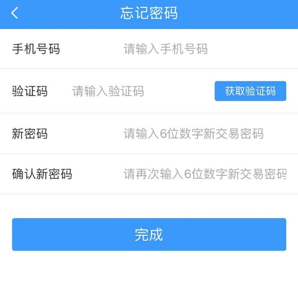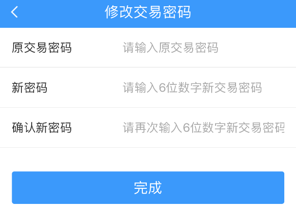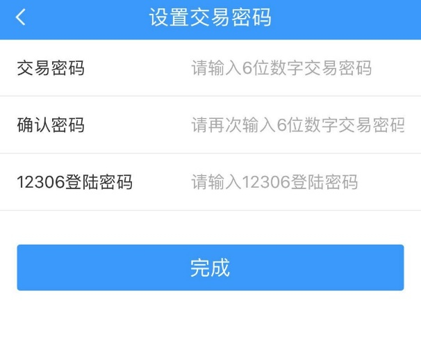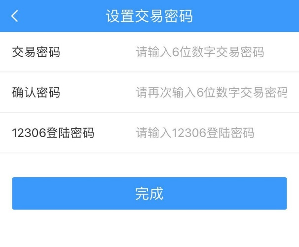 2.若客戶開戶后未設置交易密碼,首次辦理轉入業(yè)務時系統(tǒng)提示需首先設置“交易密碼”并自動跳轉至【設置交易密碼】頁面。兩次輸入六位數(shù)字交易密碼及12306登陸密碼,確認后點擊【完成】。