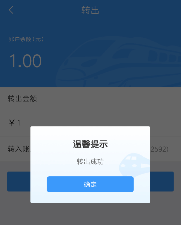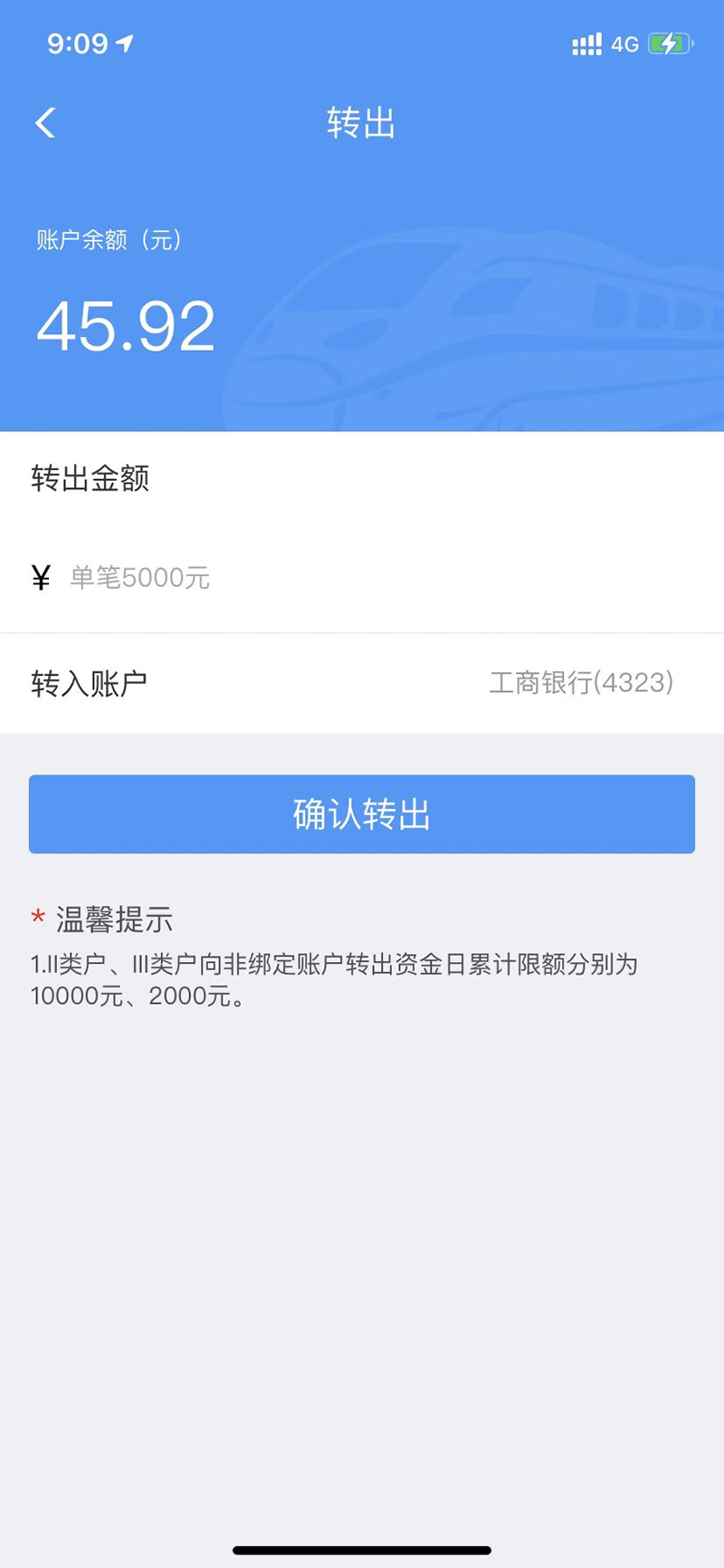 1.在鐵路e卡通首頁進入【轉出】頁面。界面顯示當前賬戶余額。